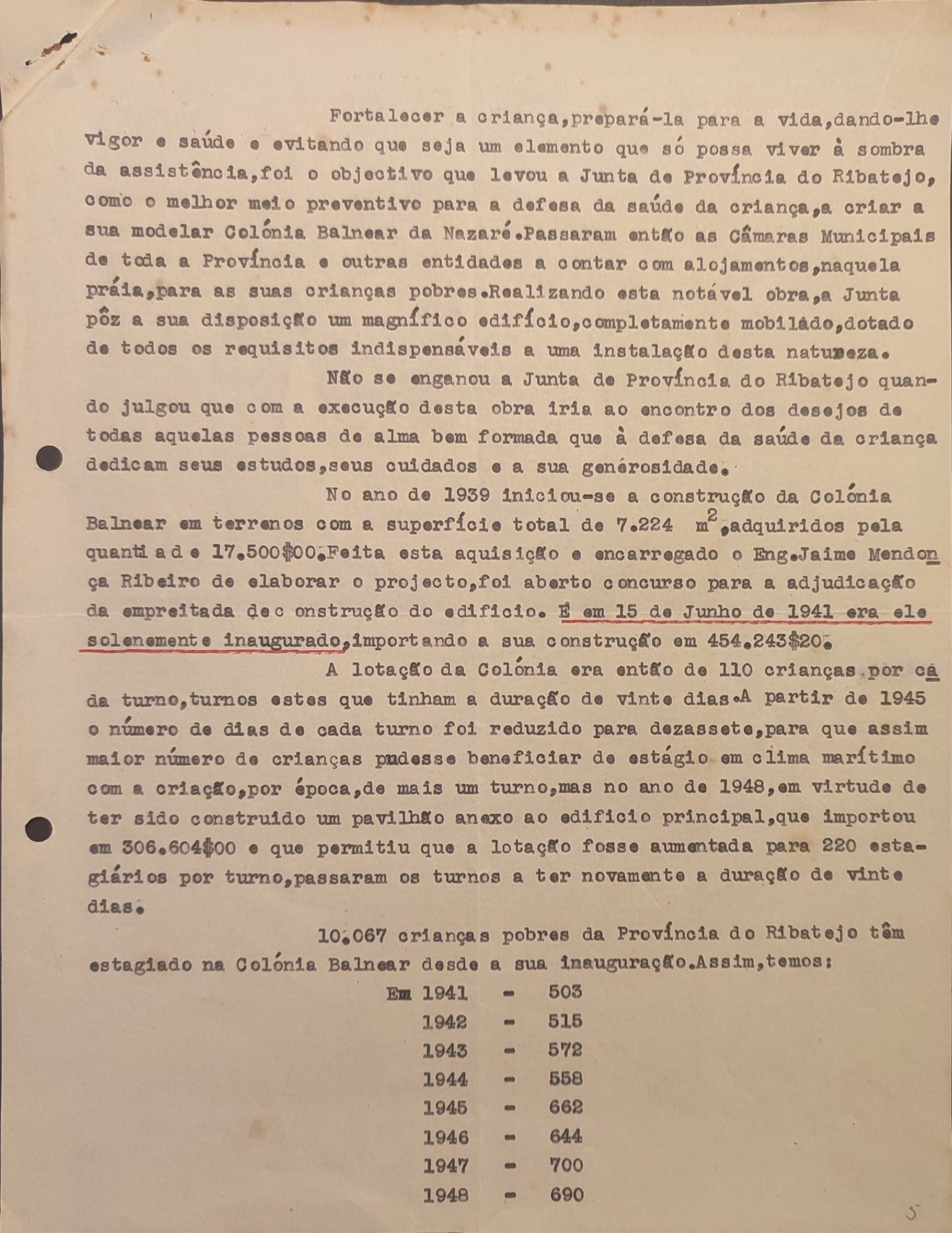 Lotação após 1948: 220 crianças / turnos 20 dias