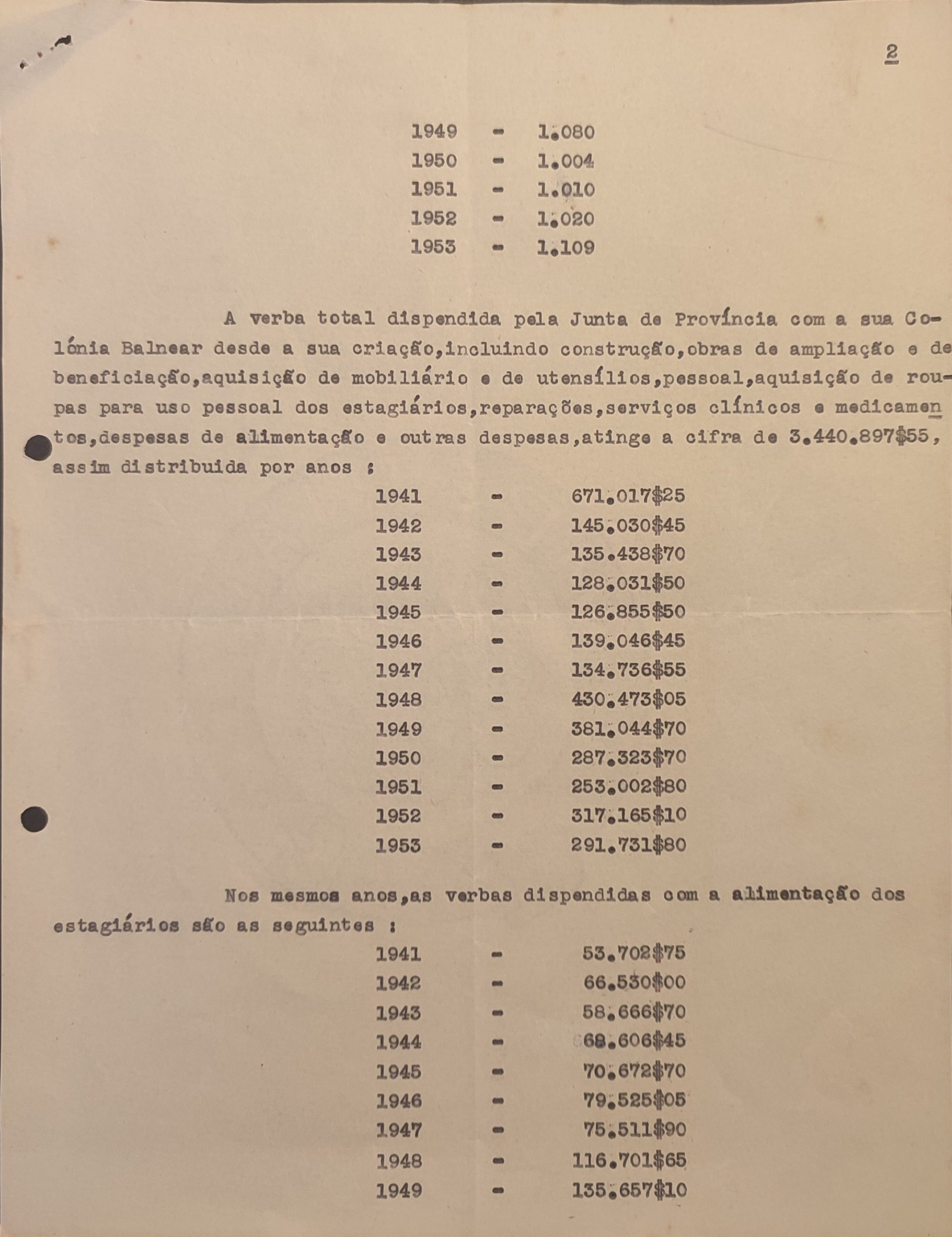 1953 – 1.109A verba total despendida pela Junta de Província com a sua Colónia Balnear desde a sua criação, incluindo construção, obras de ampliação e de beneficiação, aquisição de mobiliário e de utensílios, pessoal, aquisição de roupa para uso pessoal dos estagiários, reparações, serviços clínicos e medicamentos, despesas de alimentação e outras despesas, atinge a cifra de 3.440.897$55, assim distribuída por anos: