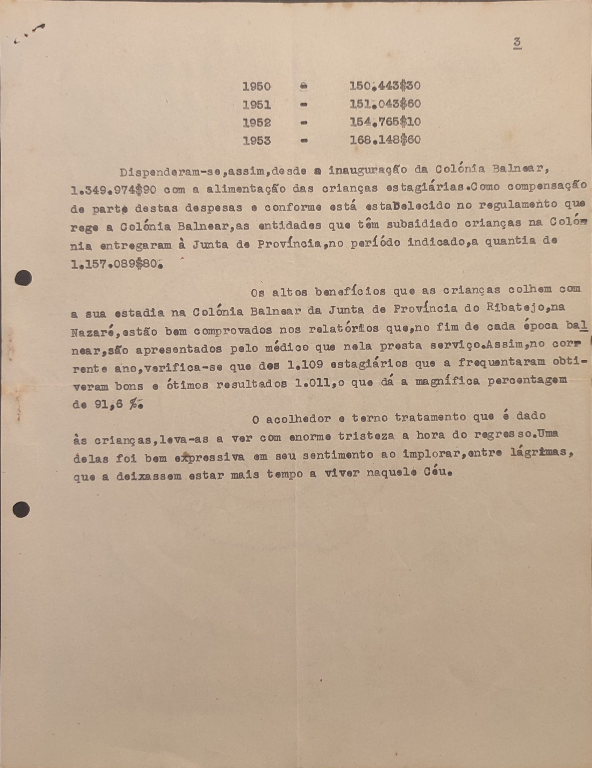 1953 – 168.148$60Despenderam-se, assim, desde a inauguração da Colónia Balnear, 1.349.974$90 com a alimentação das crianças estagiárias. Como compensação de parte destas despesas e conforme está estabelecido no regulamento que rege a Colónia Balnear, as entidades que têm subsidiado crianças na Colónia entregaram à Junta de Província, no período indicado, a quantia de 1.572.089$80.