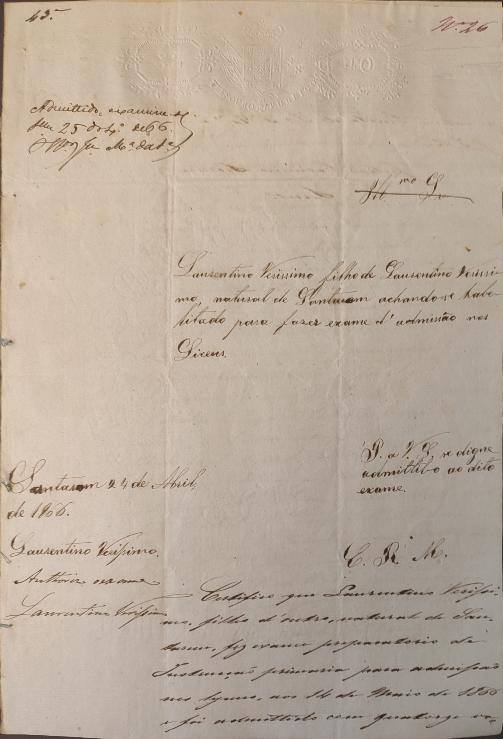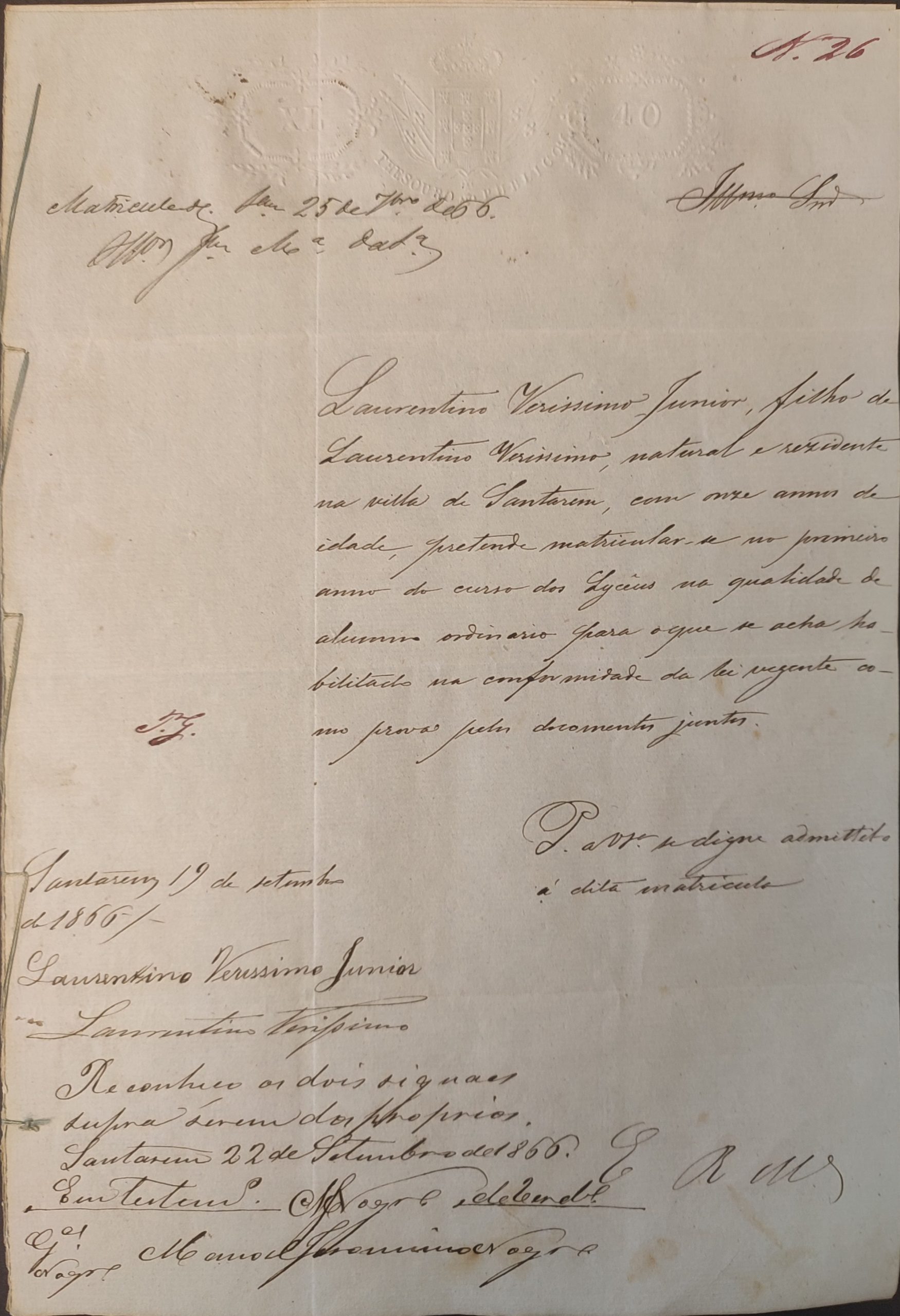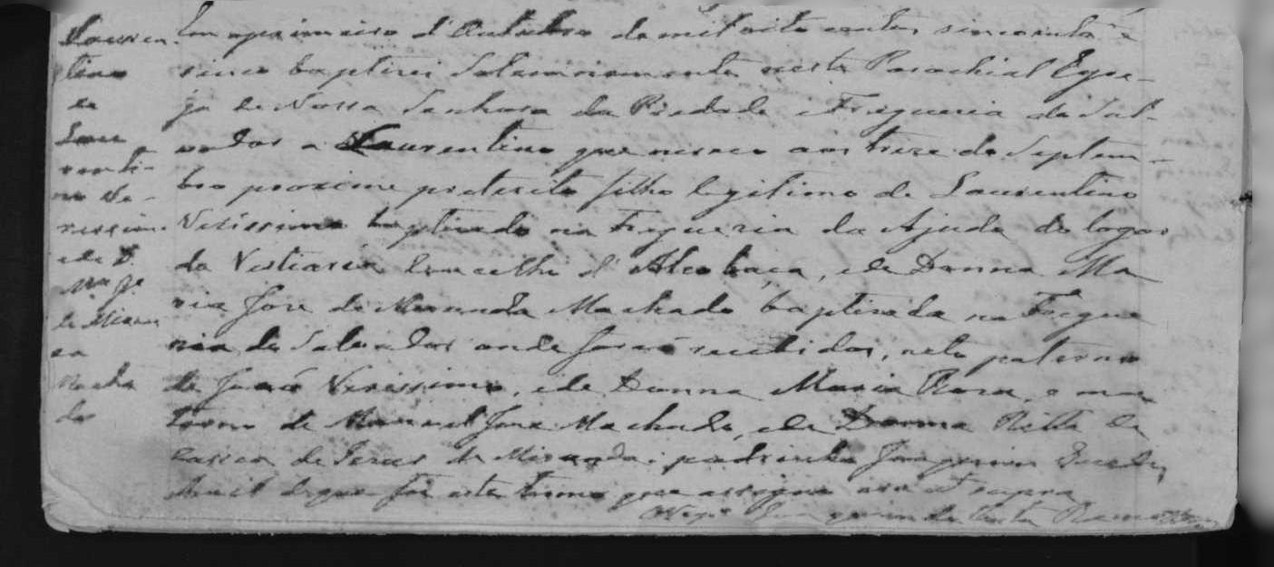 Em o primeiro d’outubro de mil oitocentos cinquenta e cinco batizei solenemente nesta paroquial igreja de Nossa Senhora da Piedade freguesia do Salvador a Laurentino que nasceu aos treze de setembro próximo pretérito filho legítimo de Laurentino Veríssimo batizado na freguesia da Ajuda do lugar da Vestiaria concelho de Alcobaça, e de Dona Maria José de Miranda Machado batizada na freguesia do Salvador onde foram recebidos, neto paterno de João Veríssimo, e de Dona Maria Rosa, e materno de Manuel José Machado, e de Dona Rita de Cássia de Jesus de Miranda. Padrinho Joaquim Guedes Amil de que fiz este termo que assino era ut supra.