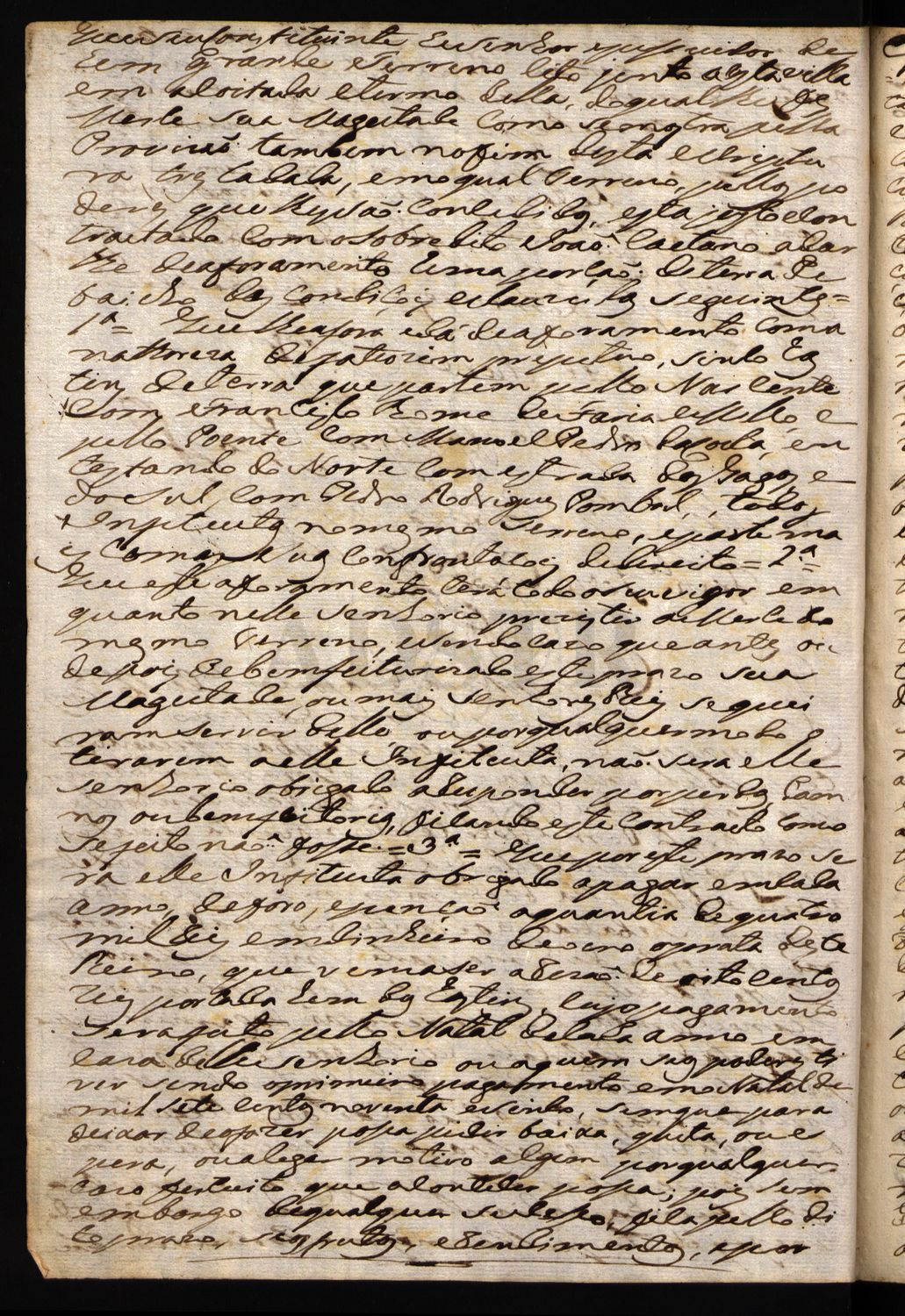 Escritura de aforamento com a natureza de fateusim perpétuo que fez Manuel Constâncio, cirurgião da Câmara Real, residente em Lisboa, representado por seu procurador, António Manuel Leite Pacheco a João Caetano, regatão, residente em Almeirim de 5 hastins de terra, com suas confrontações, junto a Almeirim, na coutada e termo dela com o foro anual, pago pelo Natal, de 4$000 rs em moeda de ouro ou prata deste reino.