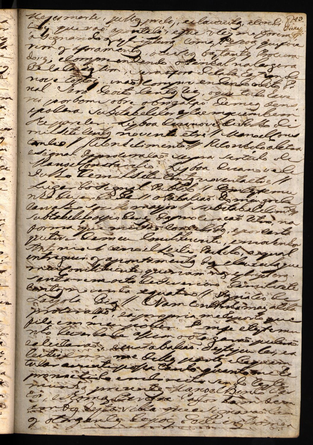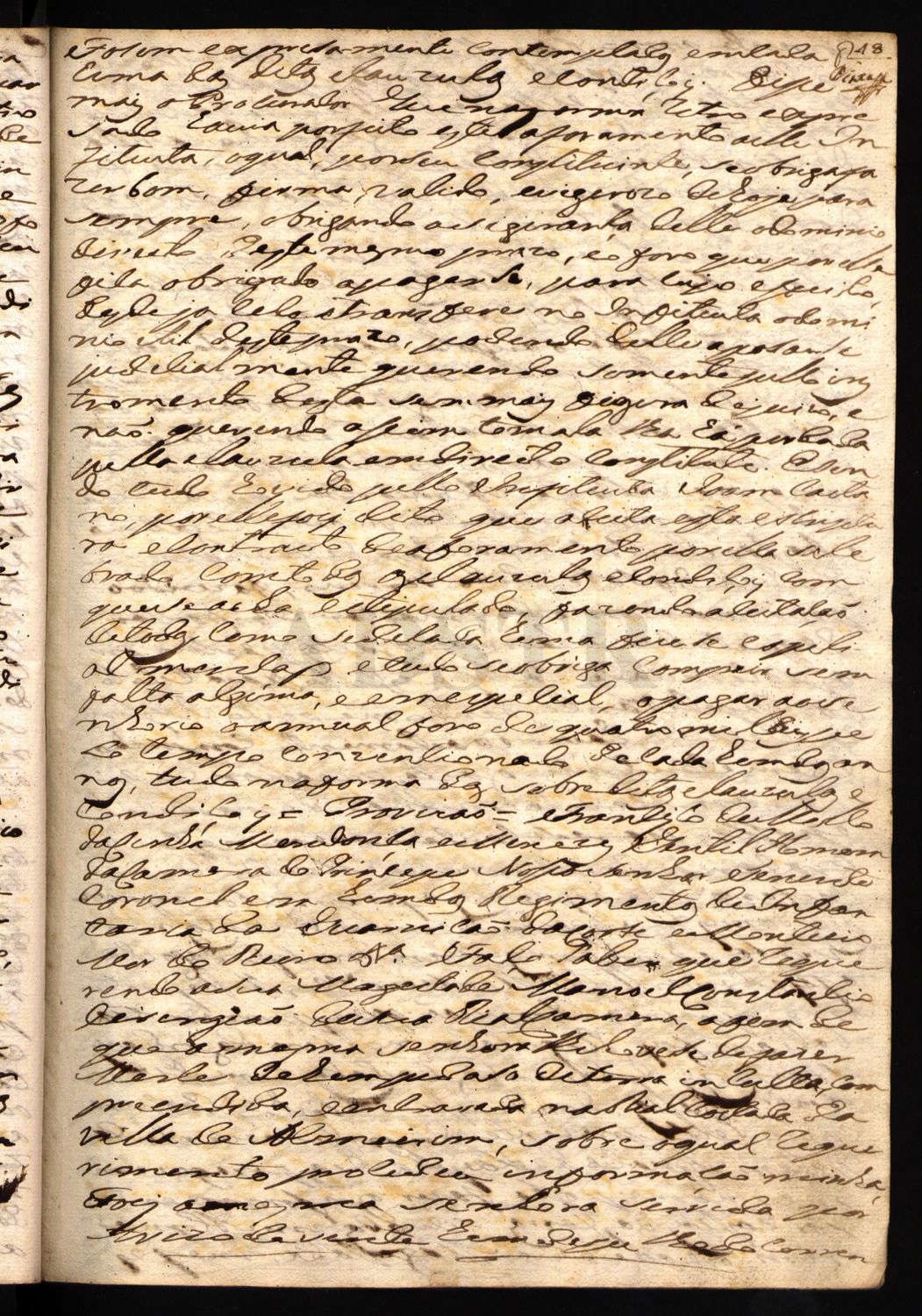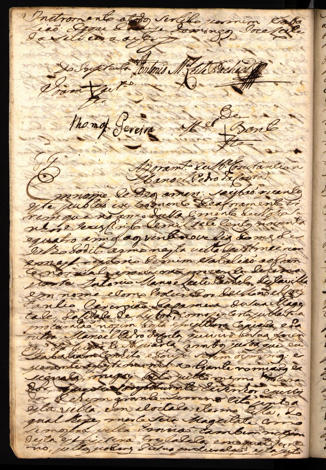 PROVISÃO Francisco de Mello da Cunha Mendonça e Meneses Gentil Homem da Câmara do Príncipe Nosso Senhor Tenente-Coronel em um dos Regimentos de Infantaria da Guarnição do Norte e Monteiro Mor do Reino etc. ª Faço saber que requerendo a Sua Majestade Manuel Constâncio, cirurgião de sua Real Câmara, afim de que a mesma senhora lhe houvesse de fazer mercê de um pedaço de terra inculta, compreendida e encravada na Real Coutada da vila de Almeirim sobre o qual requerimento procedeu informação minha: Foi a mesma senhora servida por Aviso de 21 de Julho do corrente ano fazer-lhe mercê do mencionado terreno, o qual confronta da parte do Norte pelas terras e matos da Quinta da Goucha dos Religiosos de Santo Agostinho da vila de Santarém, e do Poente pelas fazendas denominadas Vale de Peixes e Catapereiros, do Sul, pelas terras de que Sua Majestade fez mercê a José Joaquim Puppo, e José António Martins, e do Nascente com os matos da Real Coutada, tirando-se uma linha desde o ângulo da fazenda do dito José António Martins até encontrar perpendicularmente com as terras sobreditas dos matos da Quinta da Goucha: Em consequência do que mando ao Juiz da Coutada da mesma vila de Almeirim que o referido Manuel Constâncio, ou o seu bastante e legítimo procurador, haja de dar posse judicial do sobredito terreno fazendo-o primeiro medir, marcar, e confrontar, de que tudo se lavrarão os autos precisos com as solenidades da Lei, e estilo para título do suplicante, dando-me o dito juiz conta de tudo haver exatamente cumprido e remetendo-me os autos que assim se fizerem da dita medição demarcação e posse para se conservarem nesta secretaria da Montaria Mor do Reino. Caetano José dos Santos a fez em Lisboa aos nove dias do mês de Agosto de mil setecentos noventa e um anos. João Francisco da Costa a fez escrever. Monteiro Mor |
